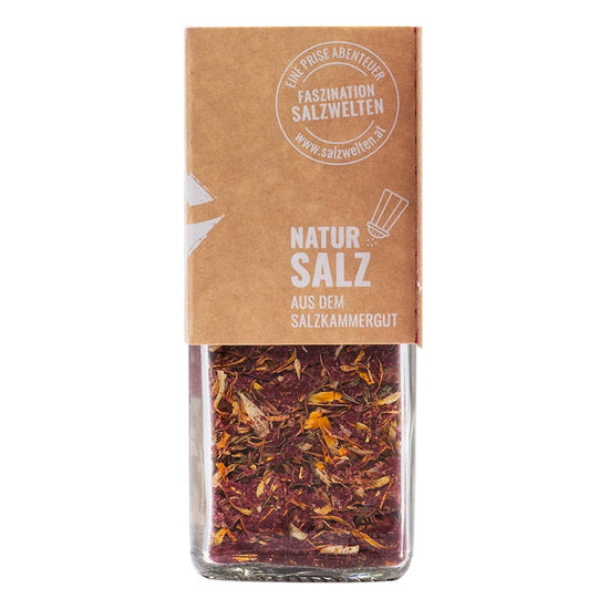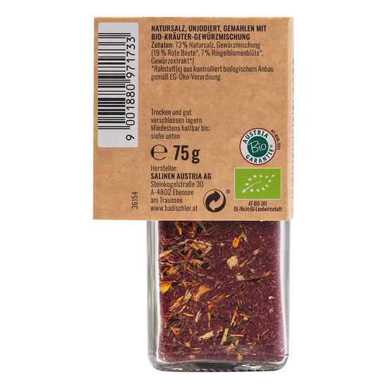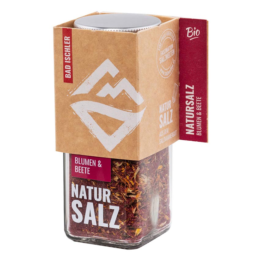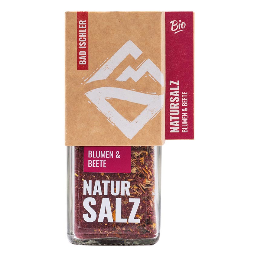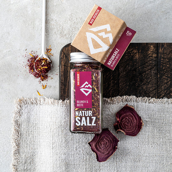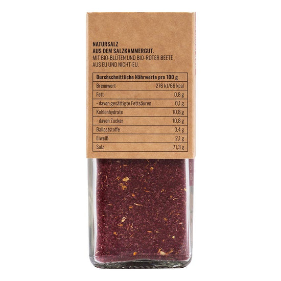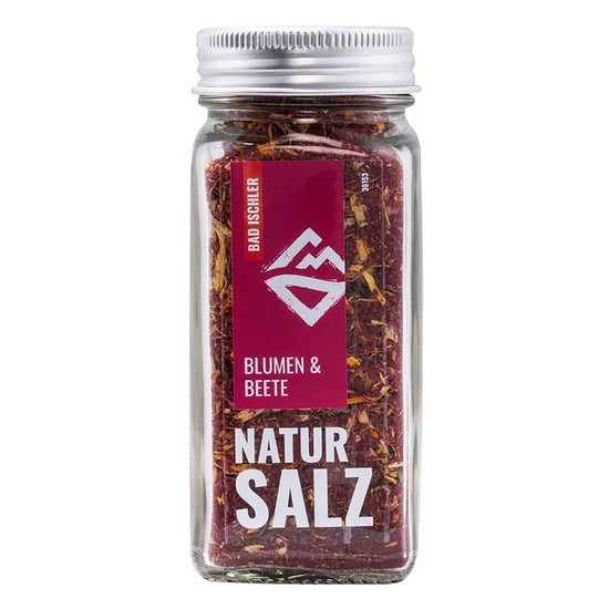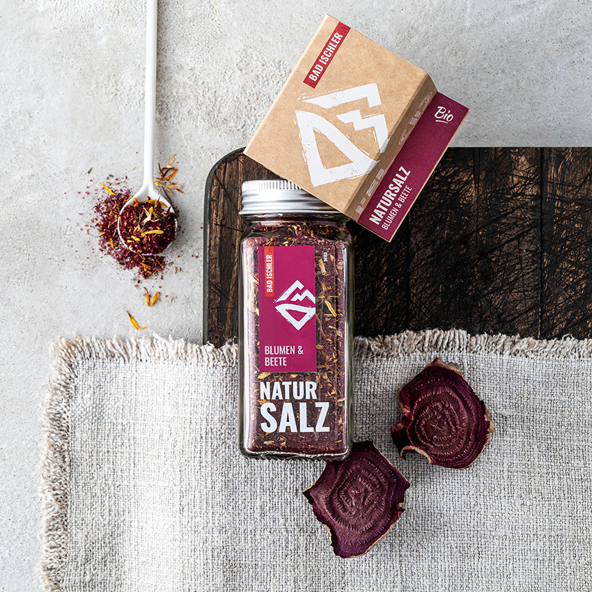 Unvergessliche BAD ISCHLER Natursalz-Mischung mit Roter Beete und Blüten aus kontrolliert biologischem Anbau, die den Wow-Effekt auf Salaten, Reis, Couscous, Aufstrichen und vielem mehr, zaubert.