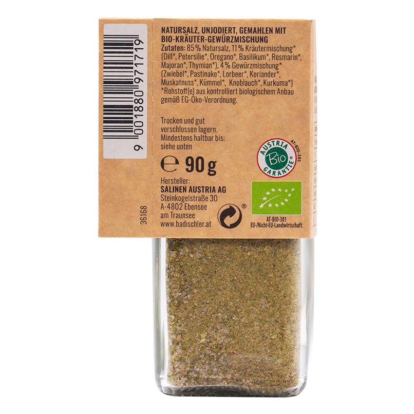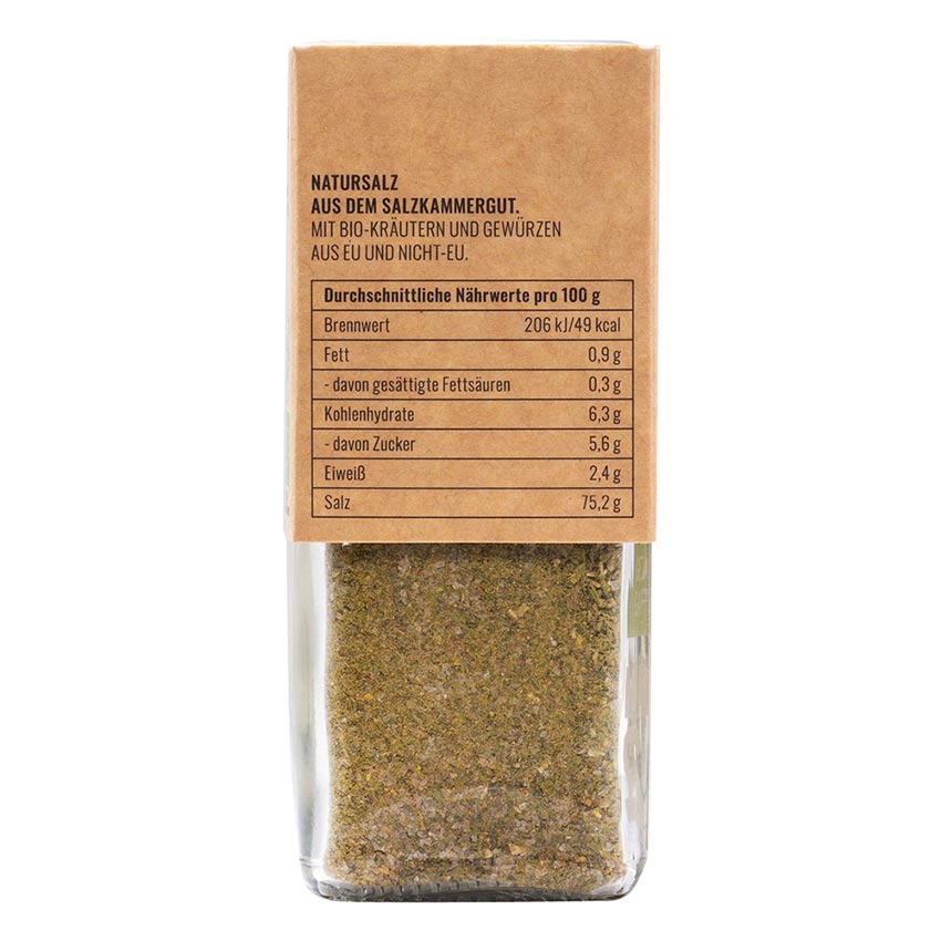 85 % Natursalz, 11 % Kräutermischung* (Dill*, Petersilie*, Oregano*, Basilikum*, Rosmarin*, Majoran*, Thymian*), 4 % Gewürzmischung* (Zwiebel*, Pastinake*, Lorbeer* Koriander*, Muskatnuss*, Kümmel*, Knoblauch*, Kurkuma*) *Rohstoffe aus kontrolliert biologischem Anbau gemäß EG-Öko-Verordnung.