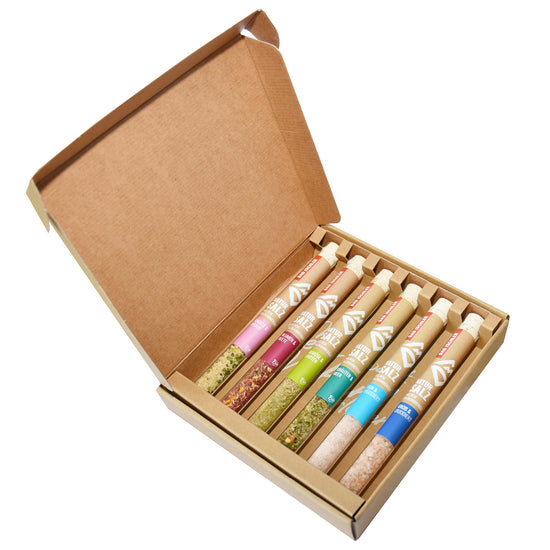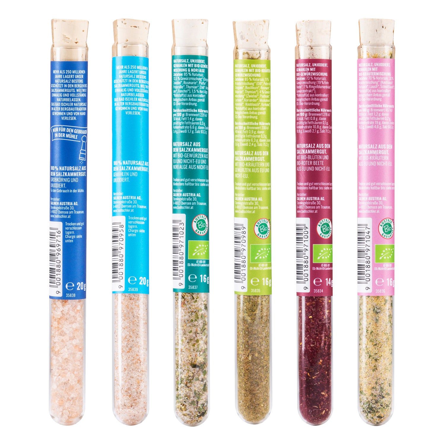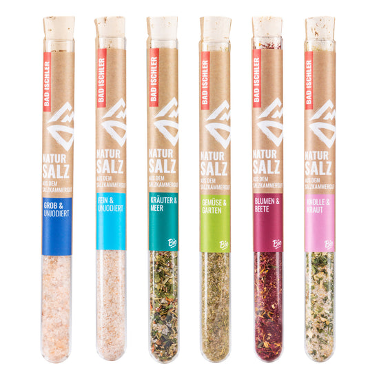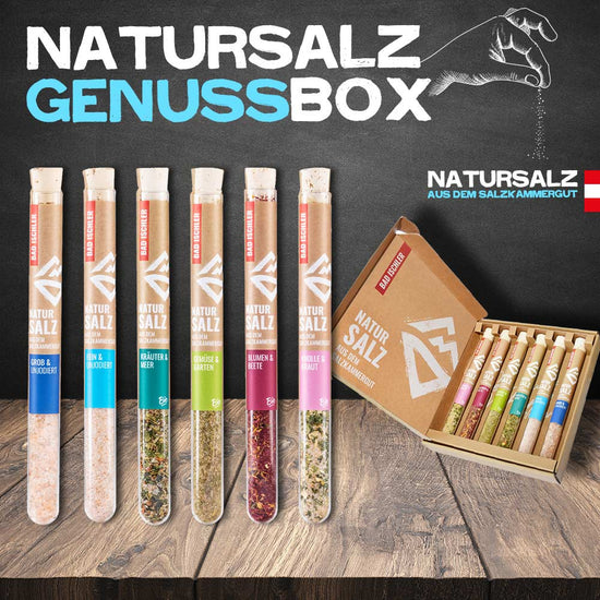 Die Natursalz Provetten Samplingbox ist die ideal Probierpackung. Enthalten sind die vier verschiedenen Natursalz Gewürzmischungen sowie das pure Natursalz in grob und fein. Ein schönes Geschenk oder zum selber verwöhnen.